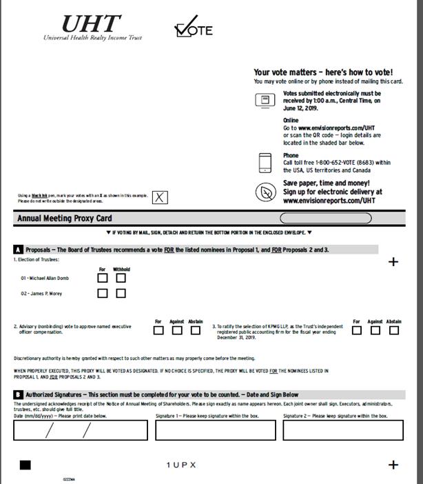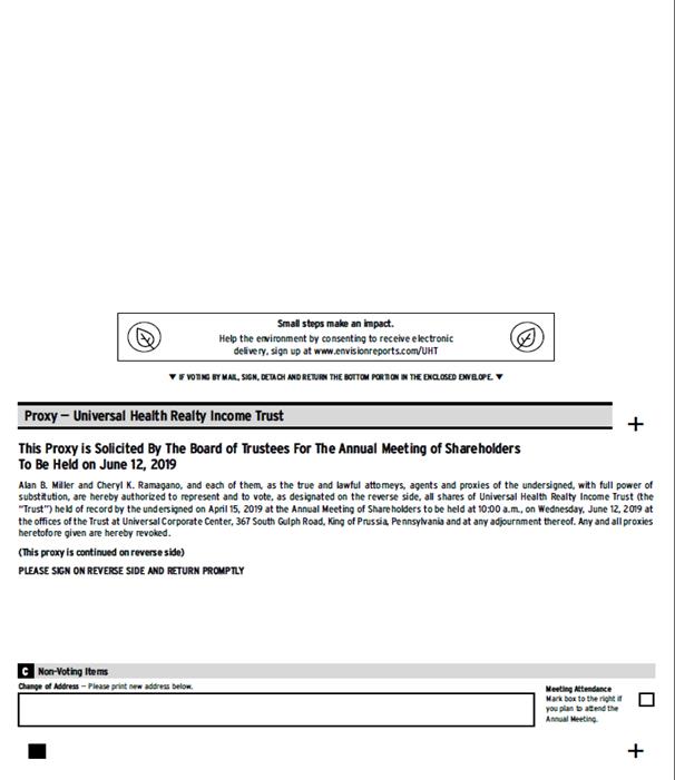 Small steps make an impact.Help the environment by consenting to receive electronicdelivery, sign up at www.envisionreports.com/UHT This Proxy is Solicited By The Board of Trustees For The Annual Meeting of ShareholdersTo Be Held on June 12, 2019 Alan B. Miller and Cheryl K. Ramagano, and each of them, as the true and lawful attorneys, agents and proxies of the undersigned, with full power ofsubstitution, are hereby authorized to represent and to vote, as designated on the reverse side, all shares of Universal Health Realty Income Trust (the“Trust”) held of record by the undersigned on April 15, 2019 at the Annual Meeting of Shareholders to be held at 10:00 a.m., on Wednesday, June 12, 2019 at the offices of the Trust at Universal Corporate Center, 367 South Gulph Road, King of Prussia, Pennsylvania and at any adjournment thereof. Any and all proxiesheretofore given are hereby revoked. (This proxy is continued on reverse side) PLEASE SIGN ON REVERSE SIDE AND RETURN PROMPTLY Proxy — Universal Health Realty Income Trust IF VOTING BY MAIL, SIGN, DETACH AND RETURN THE BOTTOM PORTION IN THE ENCLOSED ENVELOPE .Non-Voting Items Meeting Attendance Mark box to the right if you plan to attend the Annual Meeting. Change of Address — Please print new address below.